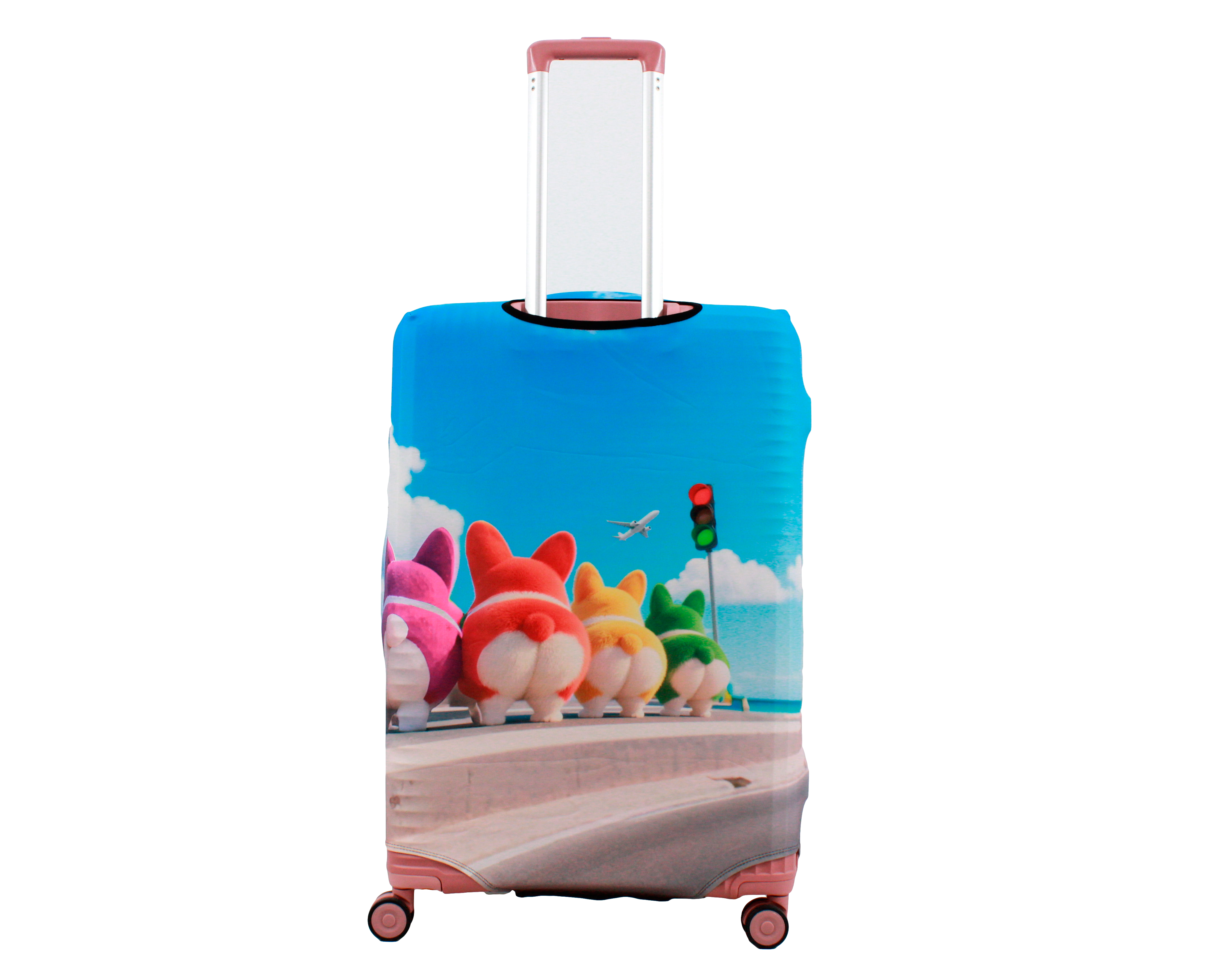 У чохлі є спеціальні прорізи для коліс валізи, а також для вертикальної та горизонтальної ручки. Для надійної фіксації чохла на валізі, він знизу обладнаний застібкою блискавкою і застібкою на резинці.  Одягається він дуже просто та швидко. Завдяки цьому стильному аксесуару Ваш багаж виглядатиме яскраво, а валіза збереже свій первозданний вигляд на довгий час.