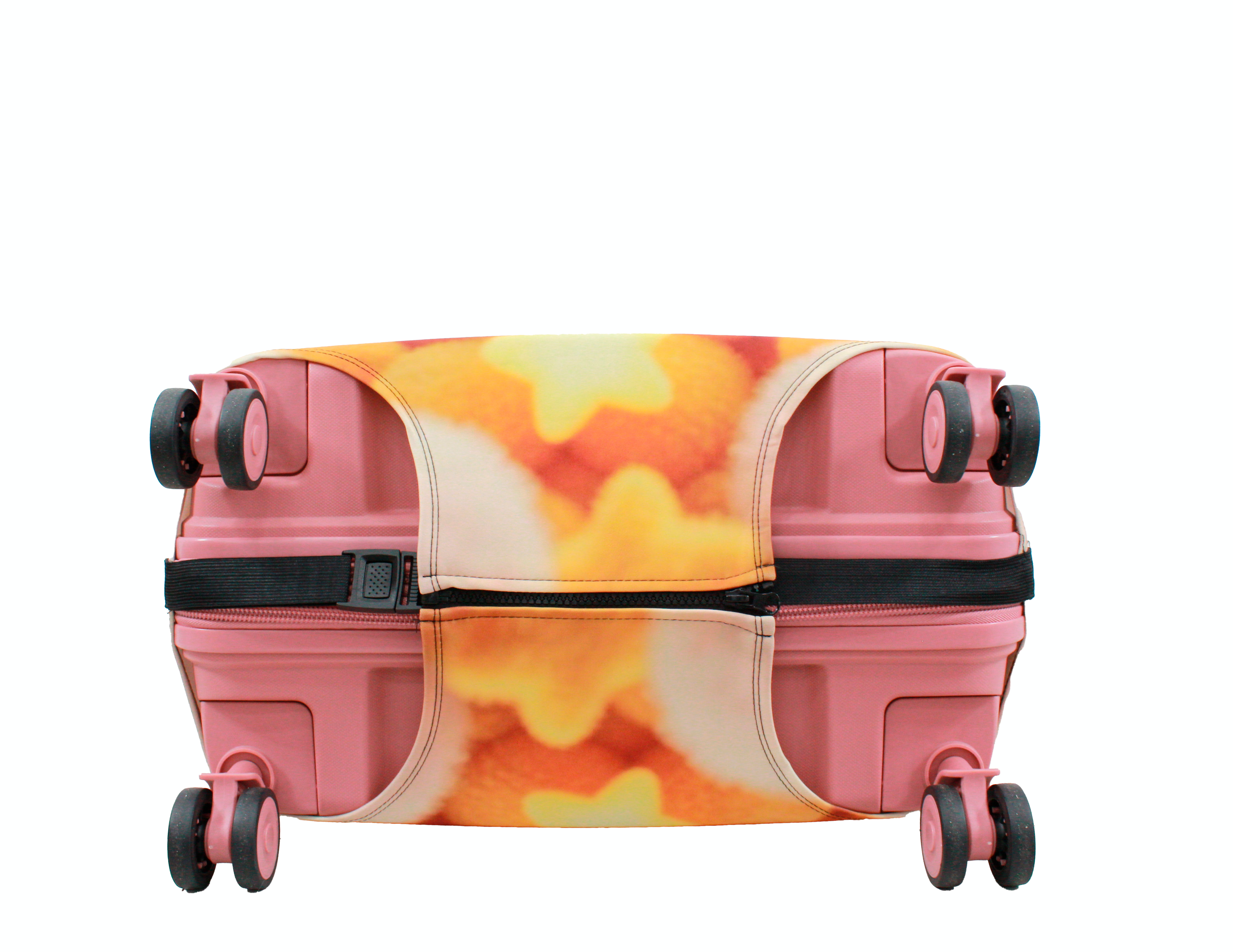 У чохлі є спеціальні прорізи для коліс валізи, а також для вертикальної та горизонтальної ручки. Для надійної фіксації чохла на валізі, він знизу обладнаний застібкою блискавкою і застібкою на резинці.  Одягається він дуже просто та швидко. Завдяки цьому стильному аксесуару Ваш багаж виглядатиме яскраво, а валіза збереже свій первозданний вигляд на довгий час.