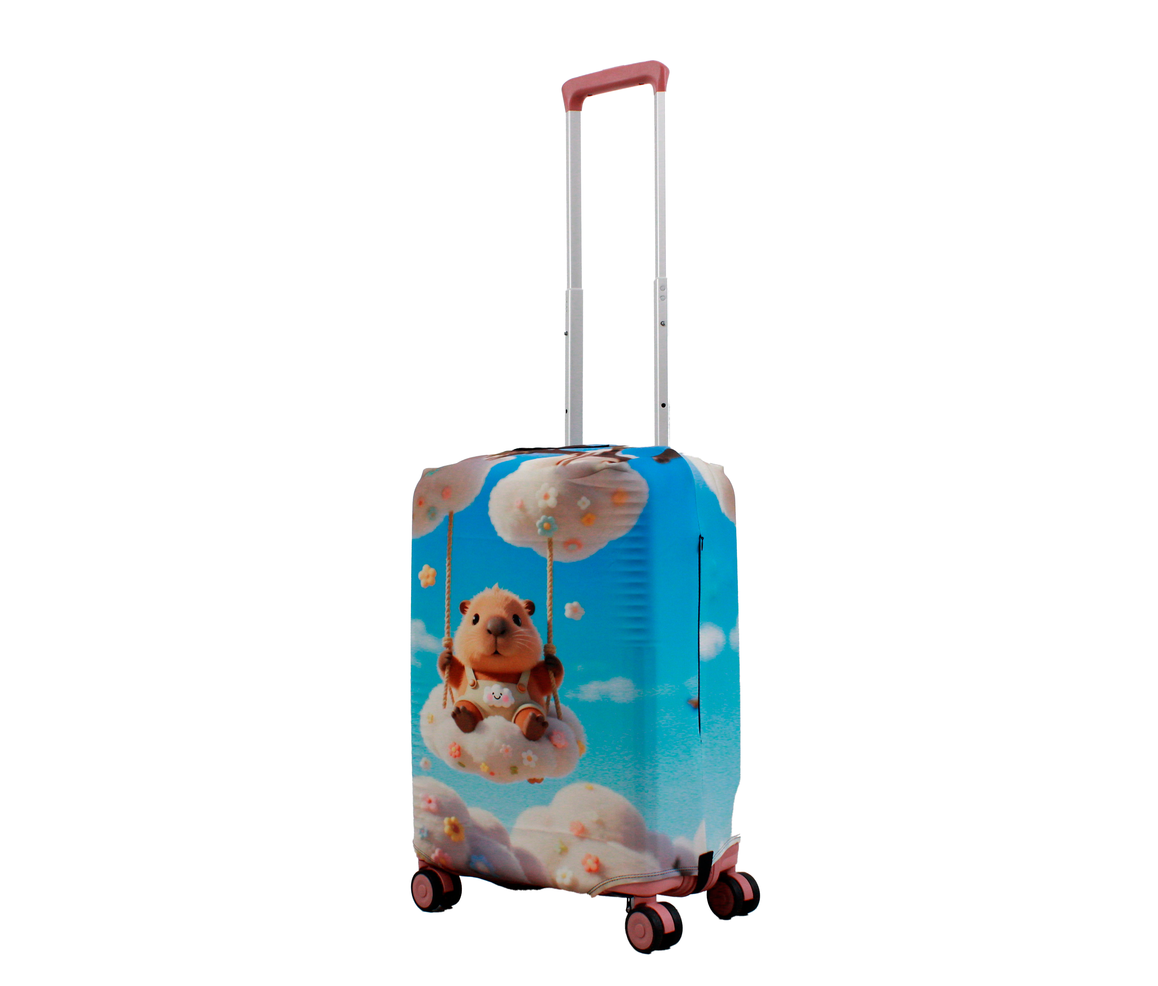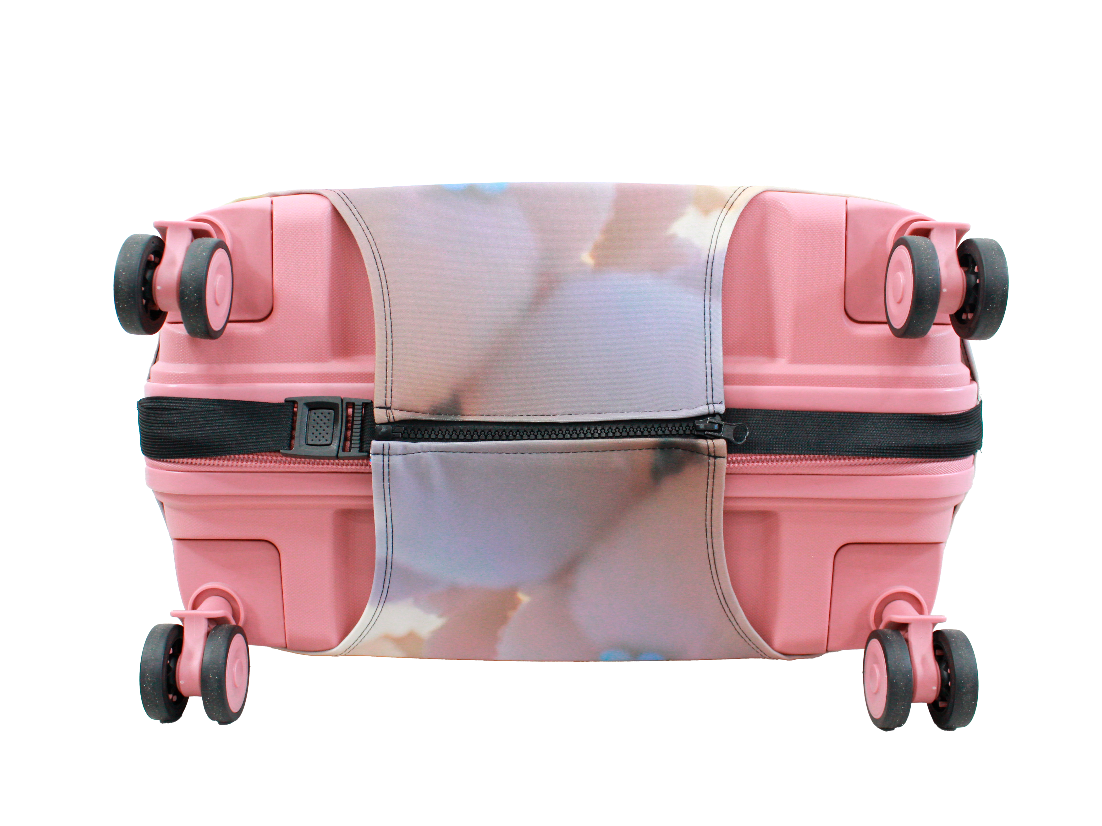 У чохлі є спеціальні прорізи для коліс валізи, а також для вертикальної та горизонтальної ручки. Для надійної фіксації чохла на валізі, він знизу обладнаний застібкою блискавкою і застібкою на резинці.  Одягається він дуже просто та швидко. Завдяки цьому стильному аксесуару Ваш багаж виглядатиме яскраво, а валіза збереже свій первозданний вигляд на довгий час.