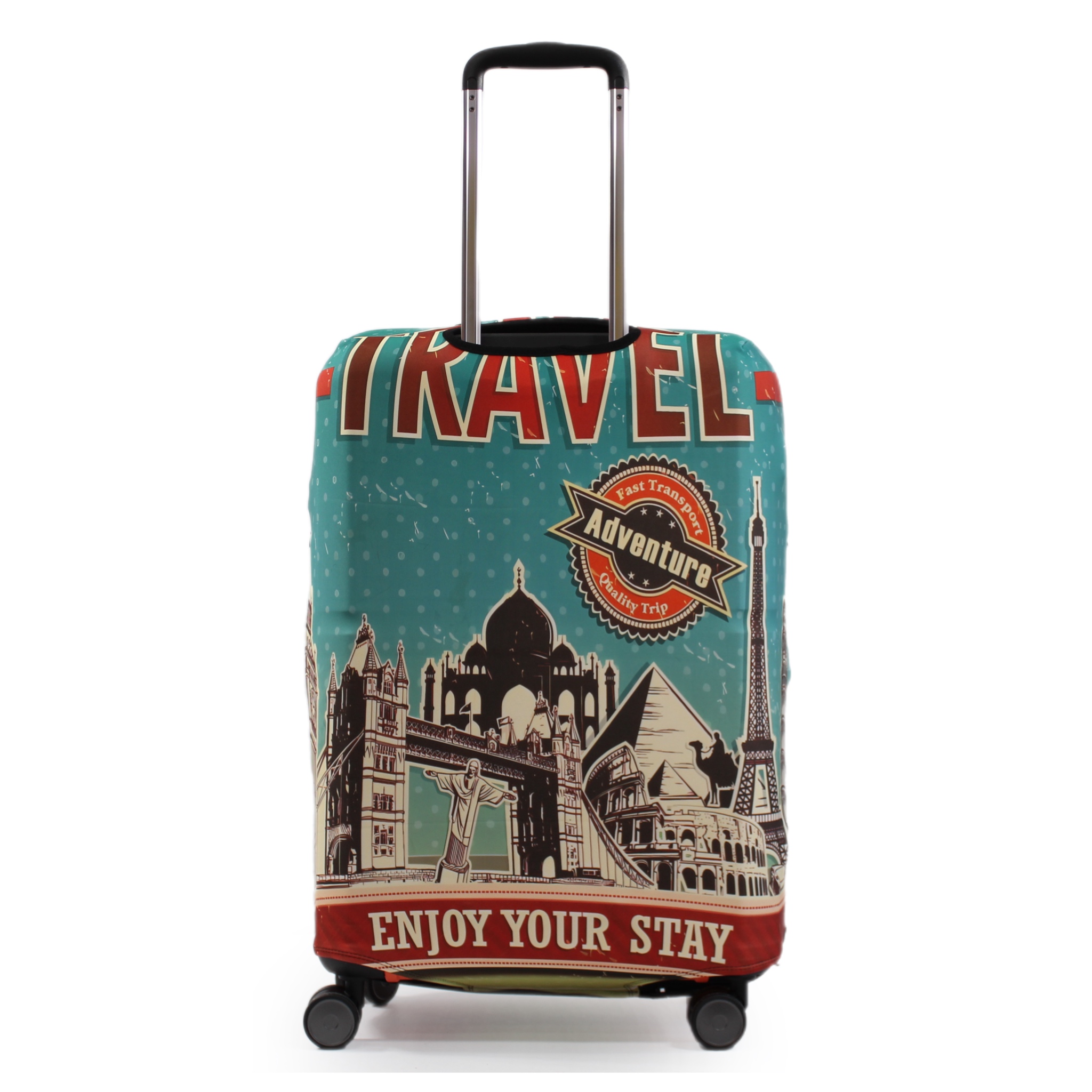 Чехол оснащен специальными вырезами для колес чемодана, а также для вертикальной и горизонтальной ручки. Для надежного фиксирования чехол имеет застежку-молнию и эластичную резинку в нижней части. Он легко и быстро одевается. Благодаря этому стильному изделию ваш багаж будет смотреться ярко, а чемодан сохранится в своем первоначальном виде на длительное время.