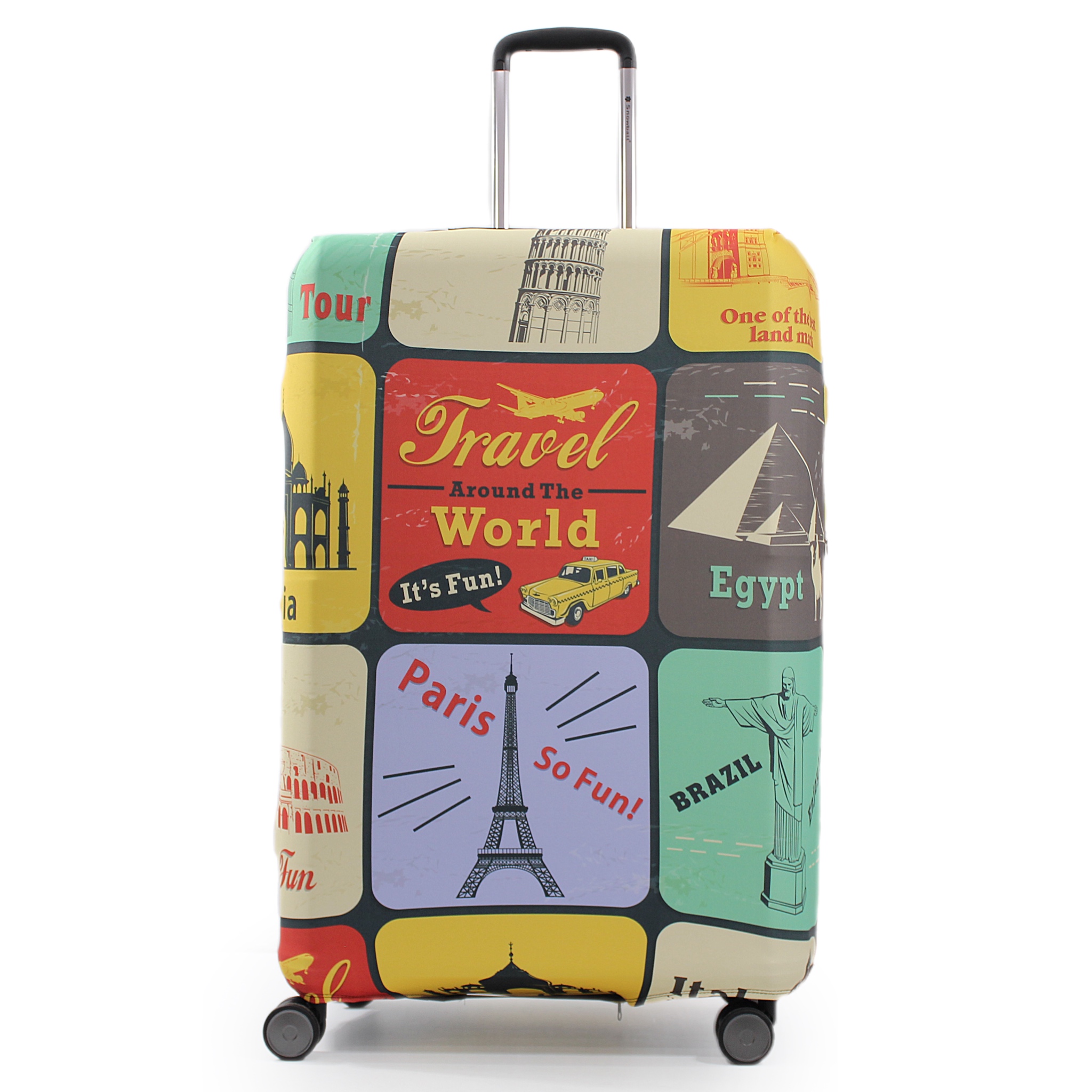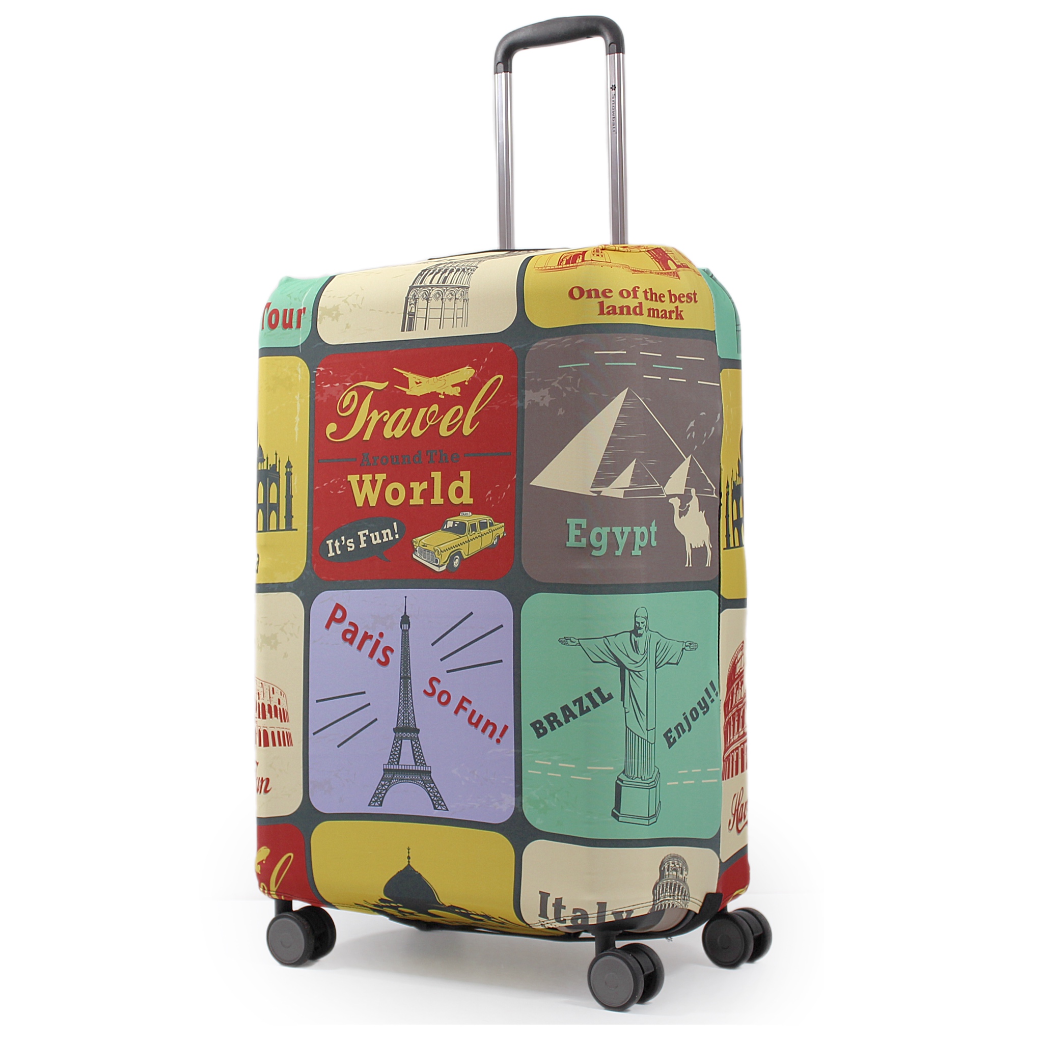 Чехол имеет специальные вырезы для колес и прорези для ручек в вертикальном и горизонтальном положении. Снизу он оснащен застежкой на молнии и эластичным фиксатором, что обеспечивает надежное крепление чехла к чемодану. Его очень легко и быстро надеть, благодаря чему ваш багаж будет выглядеть привлекательно, а чемодан будет сохранять свой первоначальный вид на долгое время.