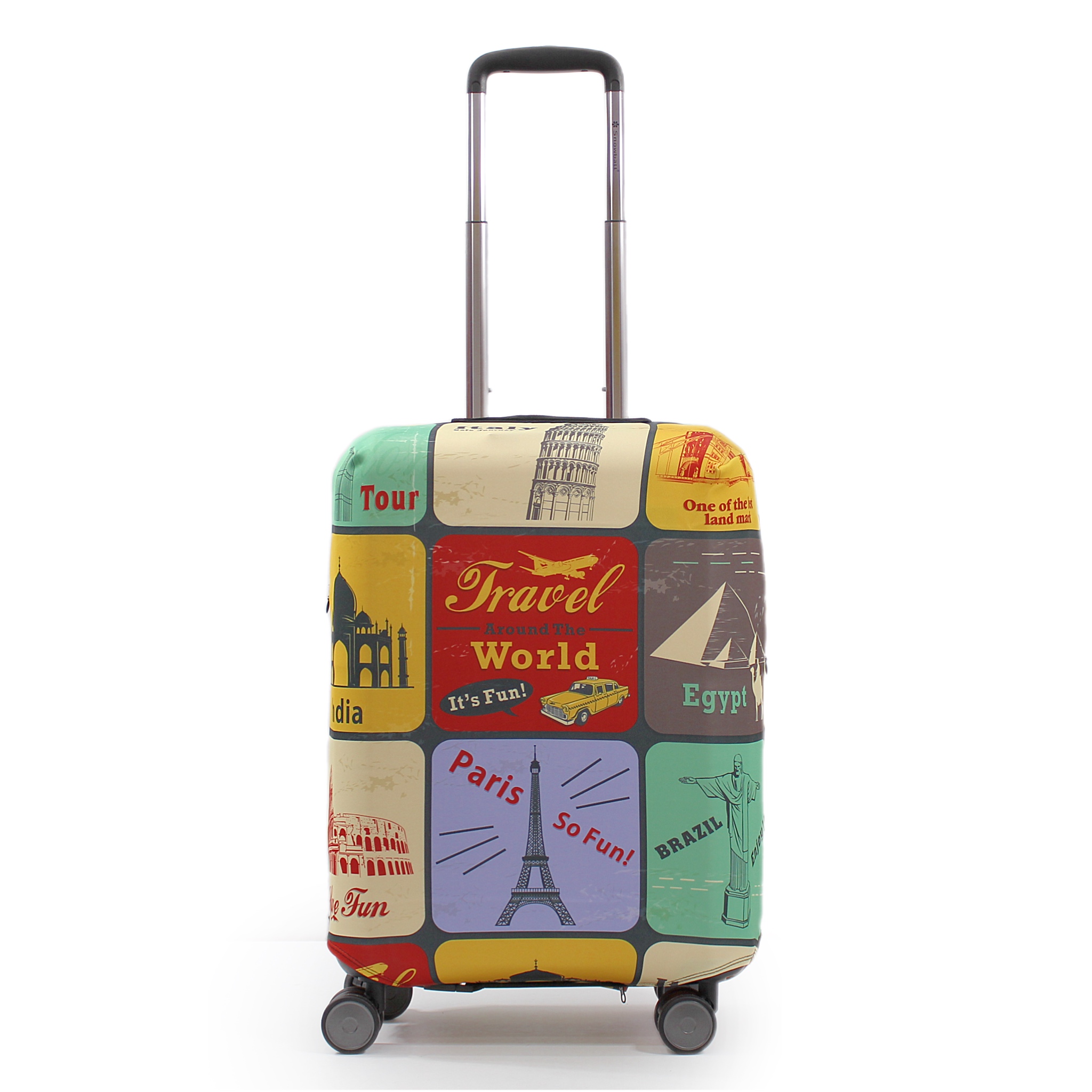Чехол малый S ( для маленьких чемоданов ) : высота без колес – 48-52см, ширина – 32-36см, глубина – 22-25см- Вес: 0.25 кг