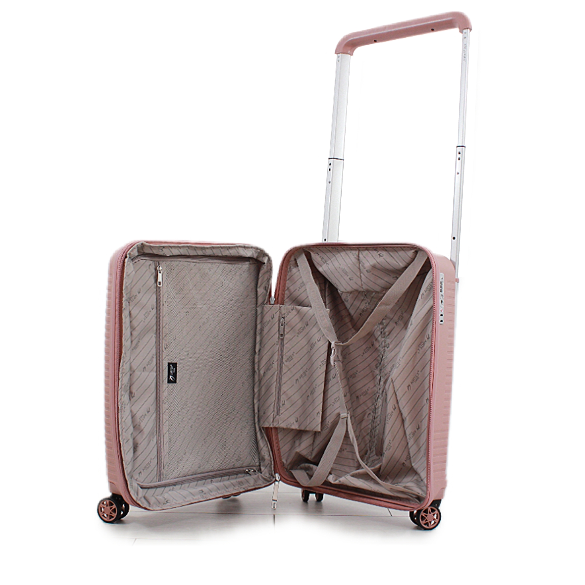 Валізи, виготовлені французьким брендом AIRTEX, зроблені з надміцного матеріалу — 100% поліпропілену. Цей матеріал є одним з найпоширеніших у виробництві якісного багажу завдяки своїй здатності витримувати механічні пошкодження, що підтверджують численні випробування, проведені у Франції. Валізи ідеально підходять для авіаперельотів, адже саме в таких умовах багаж піддається найбільшому ризику пошкоджень. Усі моделі представлено з можливістю розширення (+5 см). Безпека Ваших речей гарантована завдяки зручній застібці-блискавці з анти-злодійським механізмом та кодовому замку TSA LOCK™, що спрощує митний огляд. Чотири незалежних обертових поліуретанових колеса, розроблені з підшипниками, забезпечують безшумне обертання на 360°. Алюмінієва телескопічна ручка з кількома фіксованими положеннями дозволяє легко регулювати висоту під Ваші потреби. Для зручності переміщення валіза має дві прогумовані GEL ручки, що полегшують перенесення. Матова текстура на зовнішньому покритті корпусу зменшує ймовірність появи подряпин. Всередині валізи розташовані два відділення: одне з них закривається на блискавку, а інше обладнане ременями для надійного кріплення багажу. Крім того, для дрібниць та особистих речей передбачено дві кишені на блискавці, одна з яких має сітчасту структуру. Для зручності транспортування складеної білизни в комплекті є два регульованих ремені.
