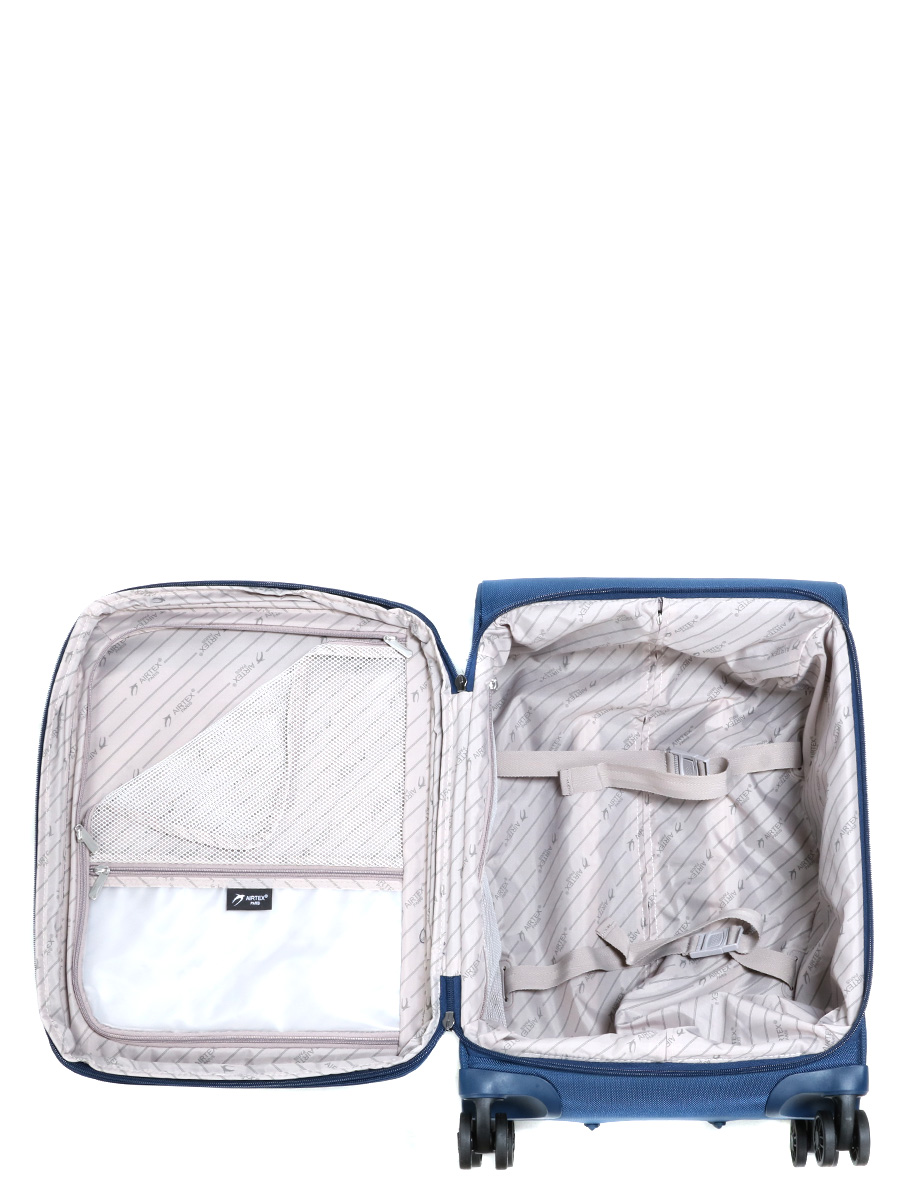 Чемоданы Airtex Gemini имеют продуманное внутреннее отделение с подложкой, которое включает в себя две отдельные секции. В одном из отделений расположены четыре регулируемых ремня, которые надежно фиксируют одежду и тяжелые предметы, такие как обувь и туалетные принадлежности, на месте во время путешествия. Другая секция, закрываемая гибким сепаратором, имеет плоскую форму и сетчатую стенку, позволяющую видеть содержимое. Карман с пластиковыми стенками идеально подходит для хранения бутылок, предохраняя от возможных утечек, а сетчатый карман пригоден для деликатных вещей. Три просторных передних кармана обеспечивают легкий доступ к транспортным документам, книгам или другим необходимым предметам, защищенным от влаги с помощью молнии. Модель также имеет небольшой боковой карман, соединенный кабелем с USB-портом A, который находится в верхней части чемодана. Это позволяет подключить внешний аккумулятор (не входит в комплект) для зарядки электронных устройств в любых условиях.