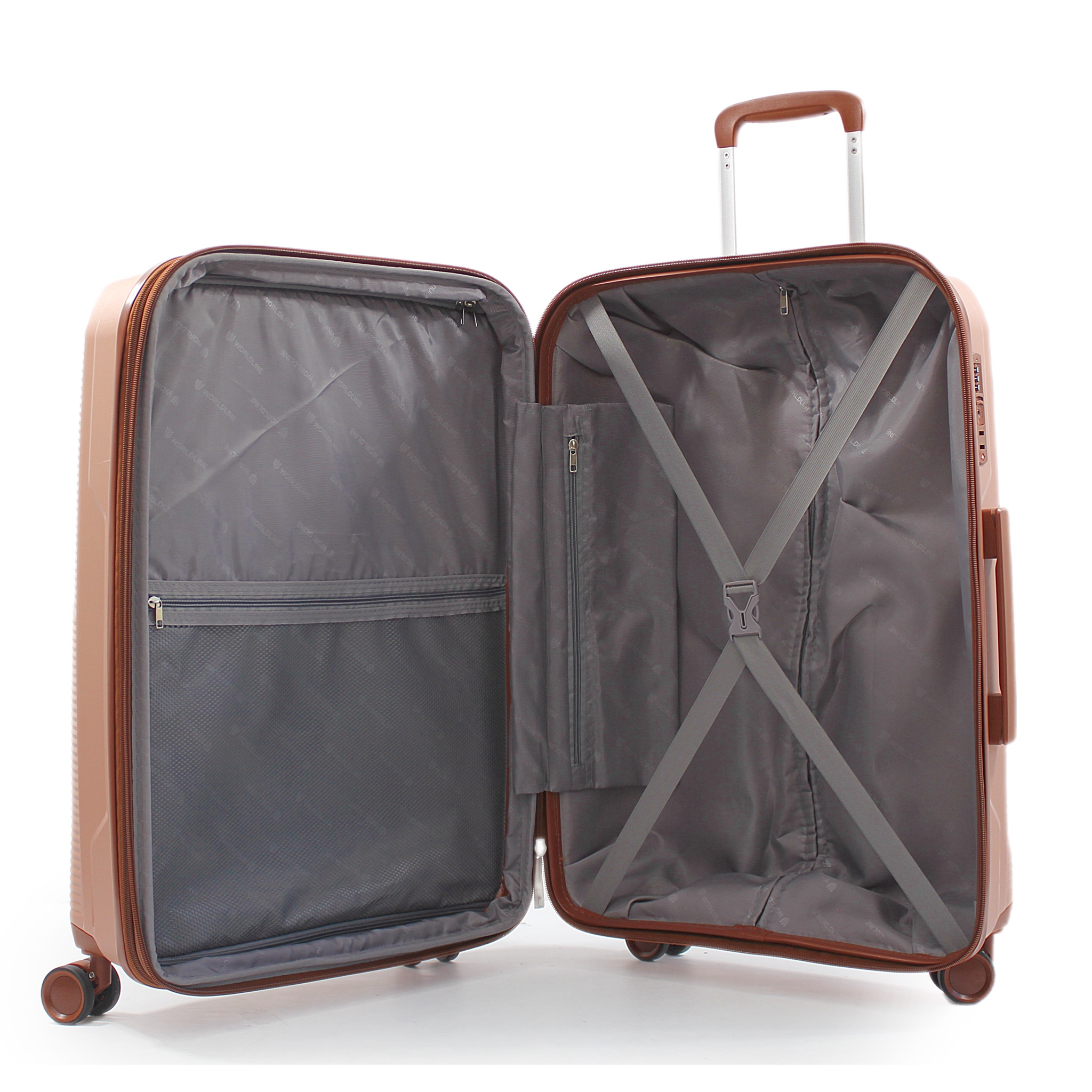 Валізи Worldline оснащені тризначним кодовим замком TSA, що дозволяє безпечний митний контроль, зберігаючи ваші речі в цілості. Легкість пересування забезпечується чотирма подвійними поліуретановими колесами з металевими підшипниками, які обертаються на 360° і працюють безшумно. Удосконалена телескопічна ручка з кількома положеннями фіксації робить маневрування валізою ще простішим. Для зручності перенесення зручними GEL ручками валіза обладнана зверху і збоку в моделях L та M, та зверху у моделі S. Валізи розмірів L і M також мають бічні ніжки, що дозволяє розташувати їх у горизонтальному положенні, коли це необхідно. Спеціально продумана внутрішня організація включає відділення з підкладкою, гнучкий лоток-роздільник на блискавці, кишеню на блискавці та два еластичні ремені для збереження ваших речей у порядку.