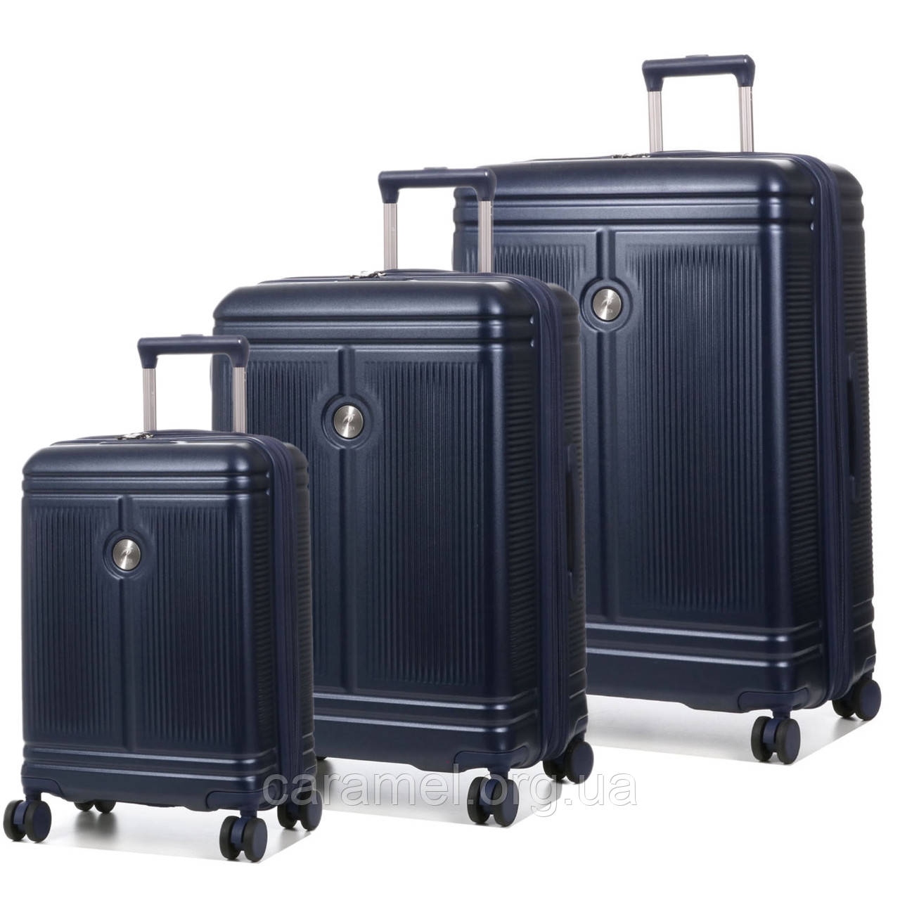В комплект входят 3 чемодана: компактный вариант для ручной клади высотой S-55 см, а также два больших чемодана L-75 см и M-65 см, которые имеют функцию расширения объема на +5 см.