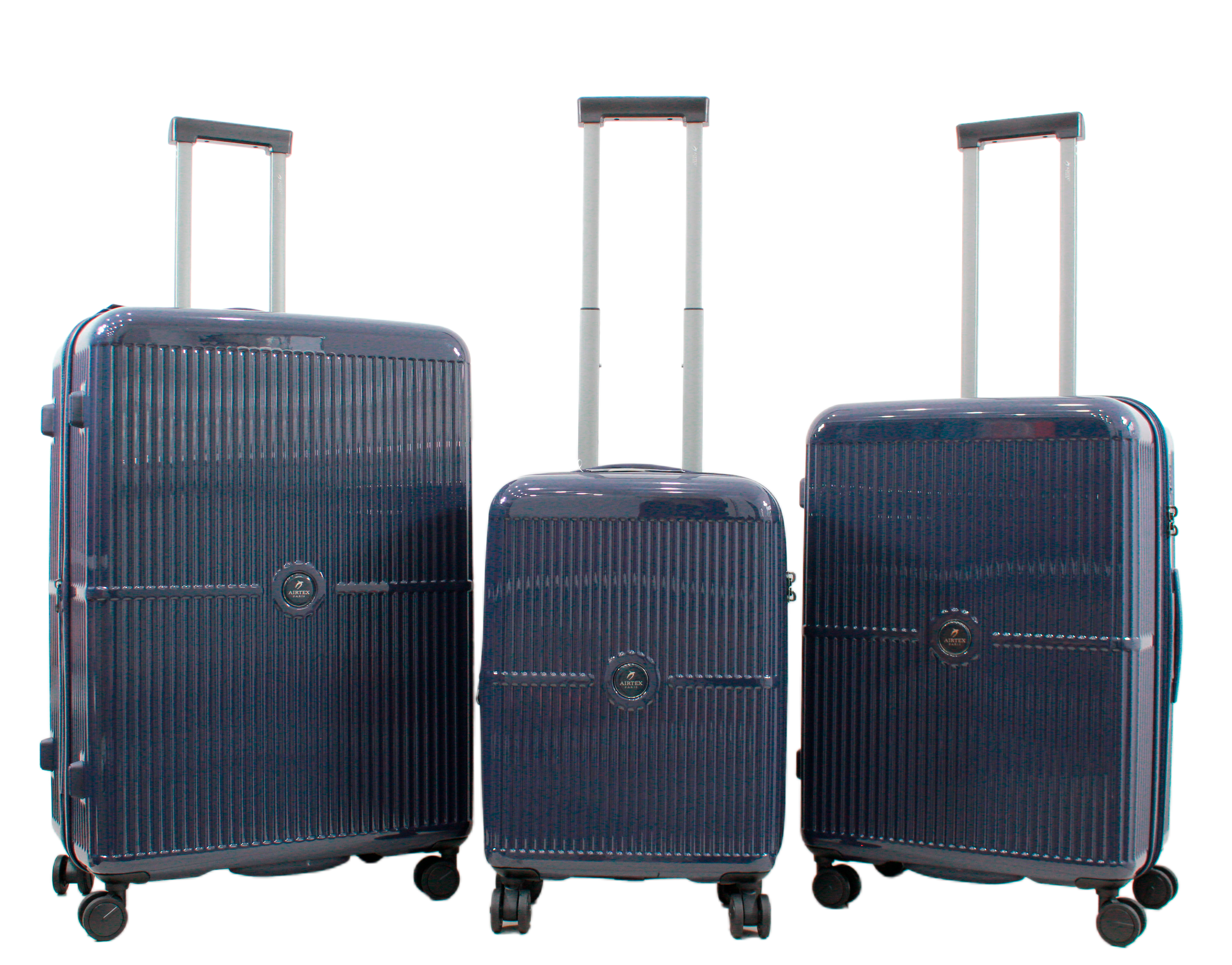 Набор из 3 чемоданов Airtex  идеально подходит для больших путешественников или для планирования семейного отдыха с необходимым багажом. Этот набор состоит в первую очередь из малого чемодана для ручной клади S-55см который совместимой с размерами EasyJet и Air France, а также среднего M-65см и большого L-75см чемоданов для багажа, предназначенных для поездок на 2 или 3 недели. Благодаря четырём независимо вращающихся полиуретановых колеса Hinomoto с подшипниками их легко перемещать и позволяют вращаться чемодану на 360°. Все три чемодана также оснащены расширением (+3см), позволяющими регулировать их объём, чтобы никогда не испытывать нехватки места.