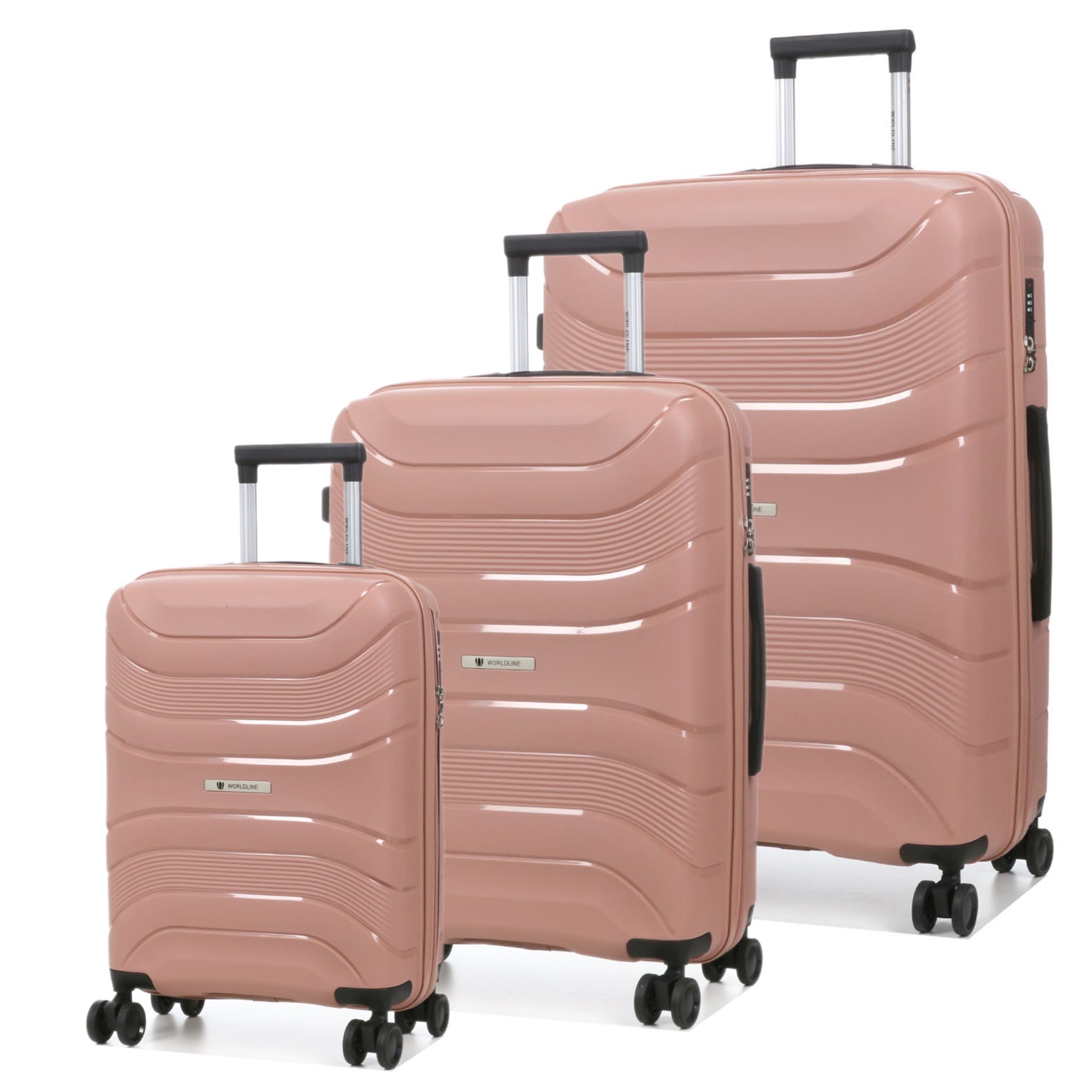 Ассортимент Worldline включает: компактный ручной чемодан S-55 см, а также две большие модели M-65 см и L-75 см. Самый большой чемодан L-75 см отличается щедрым объемом, подходящим для перевозки значительного количества вещей. Средний вариант M-65 см пригодится женщинам и подросткам, в то время как малый размер S-55 см идеально подходит для ручной клади в большинстве авиакомпаний.