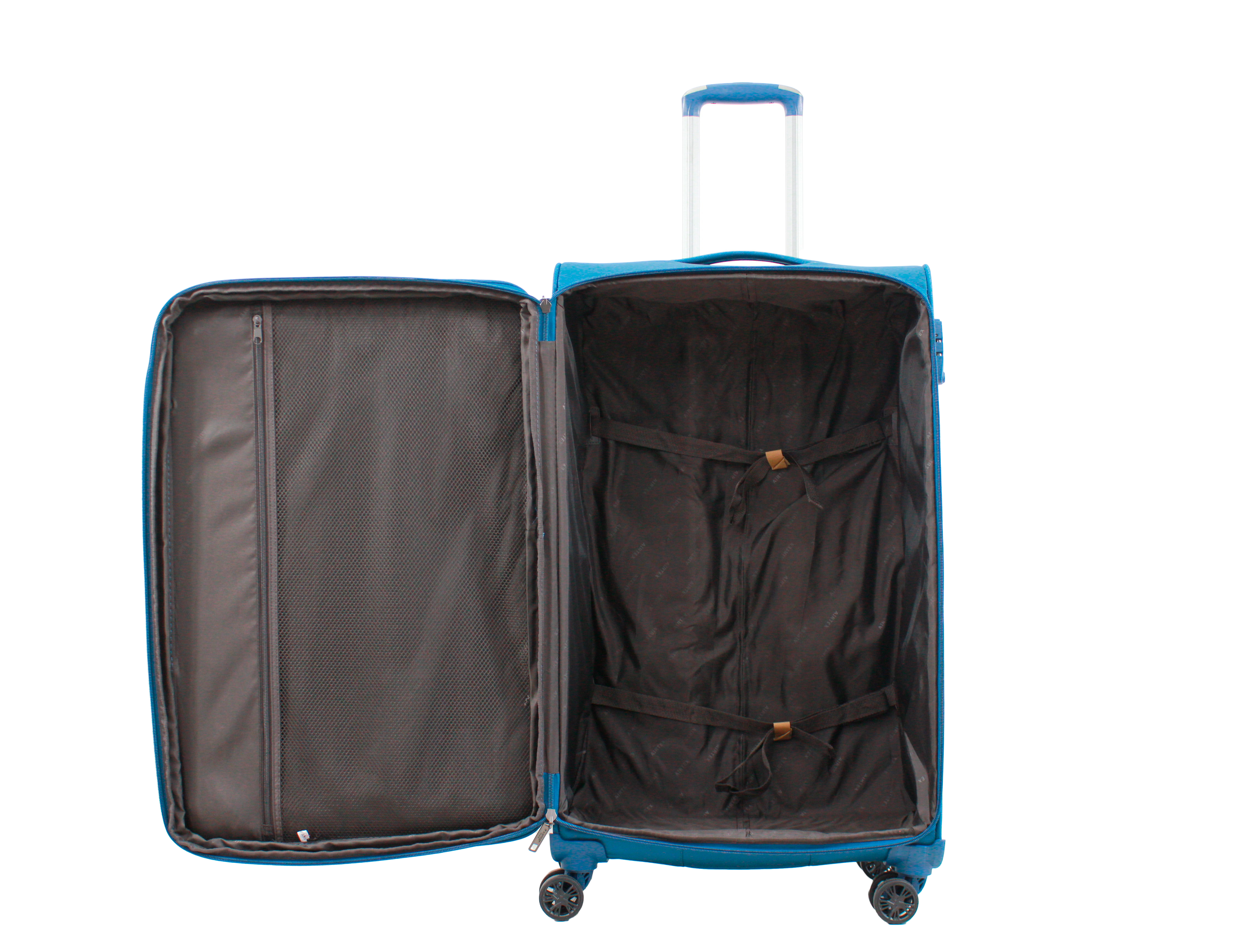 Валізи Airtex Alya мають внутрішнє відділення на підкладці та два відділення. Чотири регульовані ремені, закріплені в одному з них, утримують одяг і більш важкі предмети (взуття, туалетне приладдя) на місці протягом усього шляху. Інше відділення, розташоване під кришкою, плоске та закривається гнучким лотком-сепаратором. Він має сітчасту стінку, завдяки якій його вміст залишається видимим. У двох глибоких передніх кишенях легко доступні транспортні документи, читальні матеріали або навіть маска і зручна подушка.