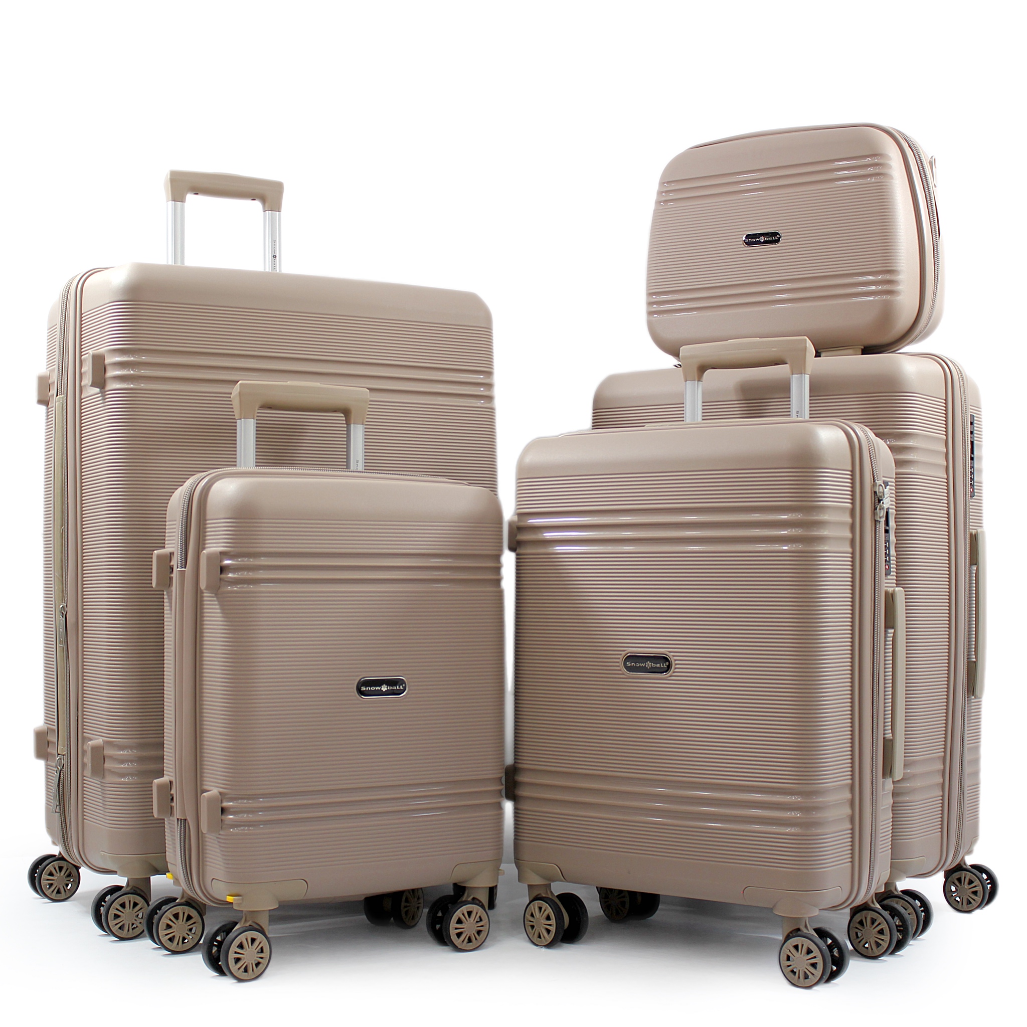 SNOWBALL поєднують стиль і надійність, стане незамінним компаньйоном у ваших подорожах або ділових поїздках. Цей набір включає чотири валізи різного розміру та б’юті кейс: б’юті кейс (BC) призначений для перевезення особистих засобів гігієни або на короткі поїздки; міні валіза (XS) висотою 49 см - ідеальний варіант для ручної поклажі з знімними колесами, що спрощує розміщення в багажному відділенні літака; маленька валіза (S) висотою 55 см, середня валіза (M) висотою 66 см і велика валіза (L) висотою 76 см. Середня та велика валізи обладнані функцією розширення обсягу (+5 см). Виготовлені з 100% поліпропілену, цей матеріал є гнучким, міцним і стійким до механічних пошкоджень. Валізи обладнані системою легкого руху з м'якими поліуретановими колесами на металевих підшипниках, які забезпечують обертання на 360°, що дозволяє легко маневрувати навіть при максимальному навантаженні. Висувна алюмінієва телескопічна ручка пропонує кілька позицій для зручного переміщення валізи. Тризначний кодовий замок TSA виконує функцію митного огляду в безпеці ваших речей, а посилена блискавка №10 гарантує їх надійність. Для зручності транспортування валіза обладнана двома гумовими ручками (GEL) зверху та з боків (для L, M, S) та з боки для XS. Наявність чотирьох бічних ніжок дозволяє розміщувати валізу у горизонтальному положенні, якщо це необхідно. Простір усередині розроблений для оптимального зберігання ваших речей: один лоток має міцні ремені для фіксації, тоді як інший закривається перегородкою з замком. У комплекті також є додаткова сітчаста кишеня на блискавці. Особливою характеристикою цієї моделі виступає фурнітура, що відповідає кольору валізи.
